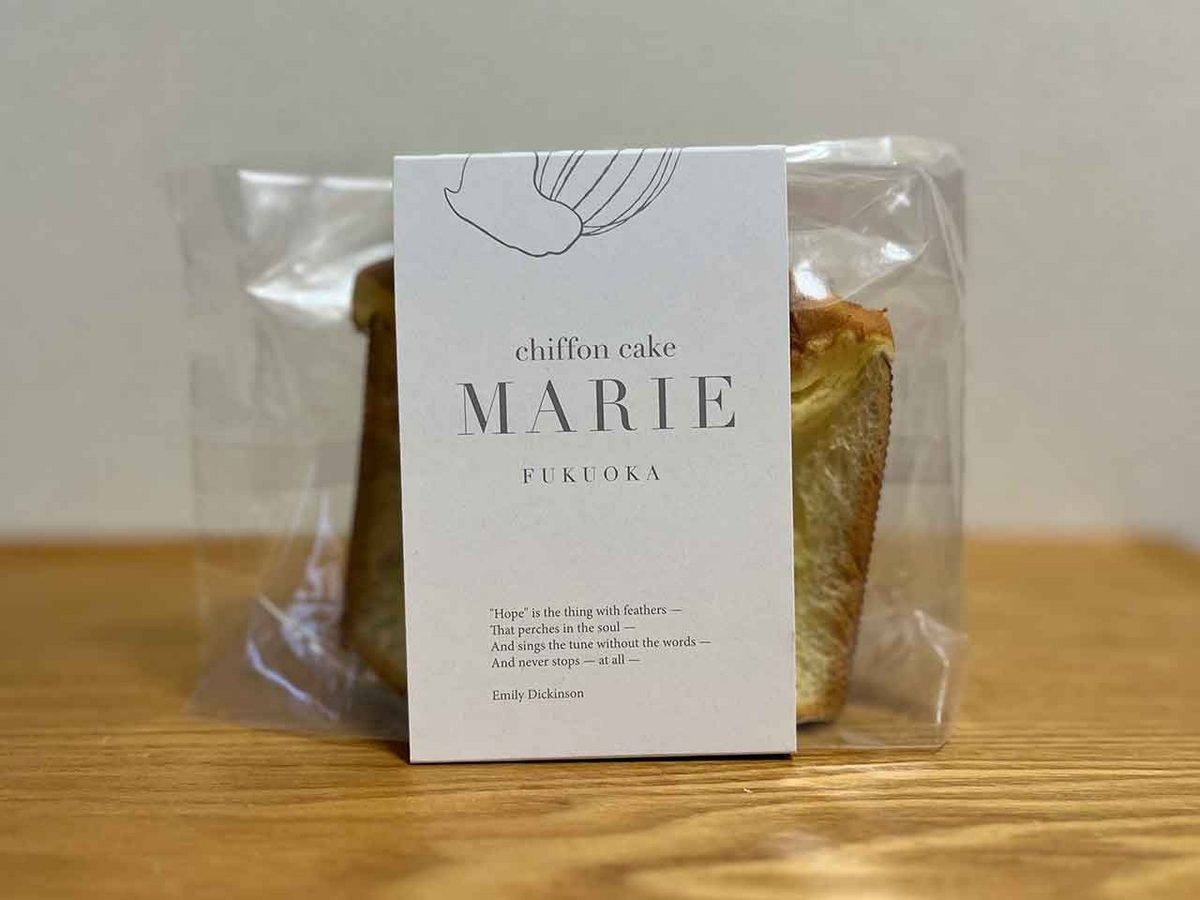 「MARIE(マリィ)」は福岡市にあるシフォンケーキ専門店です。麹は福岡県産の手作り塩麹を使用し、塩は長崎県 崎戸島・蛎浦島周辺の海水を100%使用。素材にとことんこだわった商品が特徴のお店です。 一番人気のメニューは「塩麹」もちもち生地のほんのり塩味。フワフワな食感