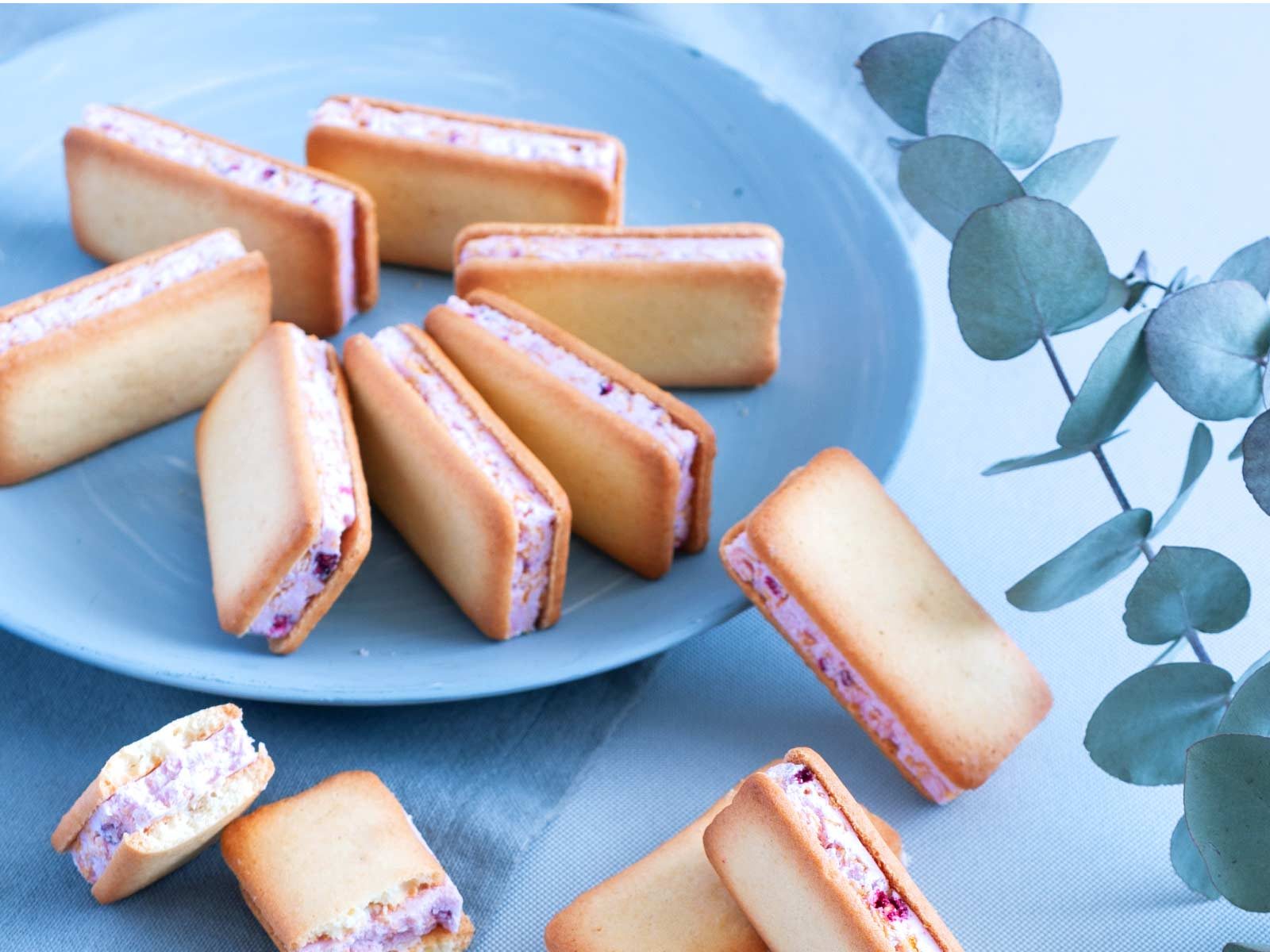 福岡県産のあまおう苺パウダーとラズベリーのフリーズドライを贅沢に使用したサンドクッキー。サクサクとした生地の間にはふんわりしたホイップチョコが入っており、ひと口食べると芳醇なバターの香りがふわっと広がります。